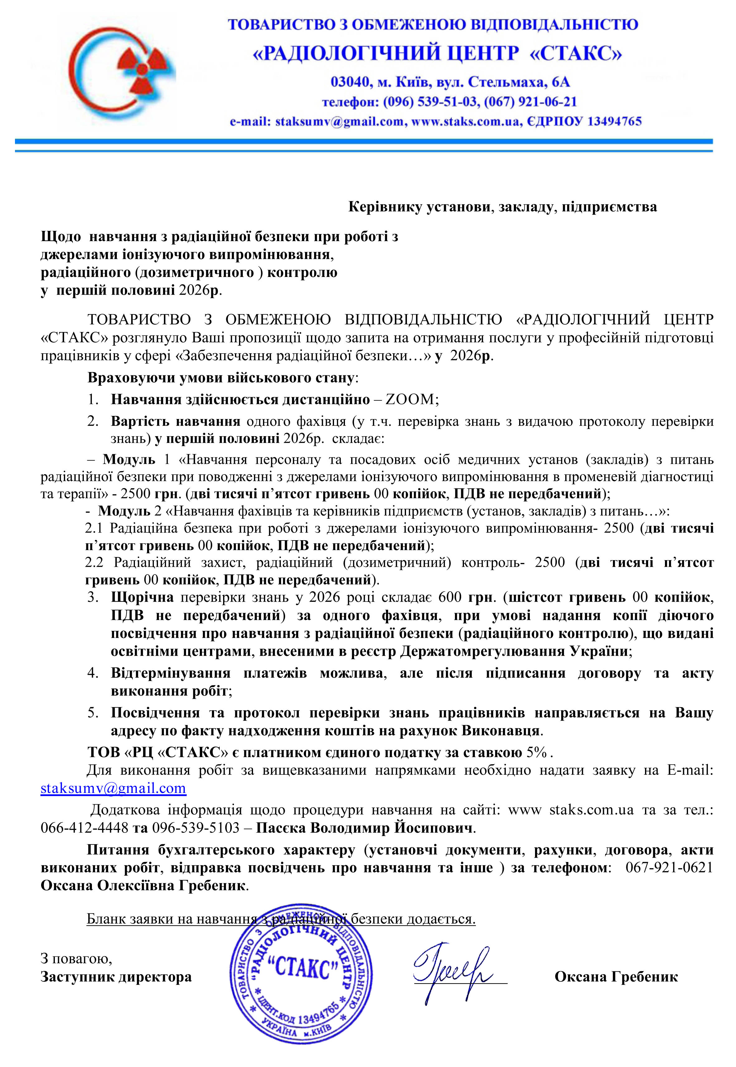 Для отримання послуг ТОВ «Радіологічний центр «СТАКС» необхідно надати відповідну заявку на e-mail: staksumv@gmail.com Додаткова інформація за телефонами (096) 539-51-03, (067) 921-06-21 - бухгалтер.